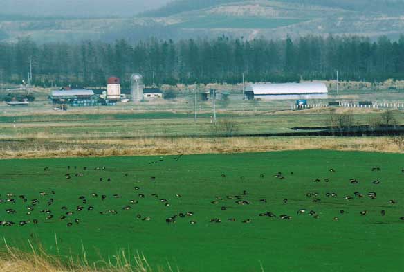 15:45〜菊池利憲牧場横(浦幌十勝川導水路)の牧草地でようやくオオヒシクイ群れと