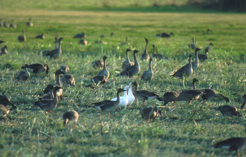 午後4時30分。ねぐら入りが近くなり、オオヒシクイが鳴き交わしを始めた時、これに呼応するかのようにハクガンも鳴き始める