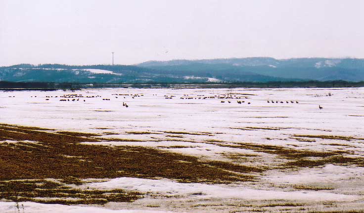 10:15〜三日月沼は全面結氷しており、沼にはガンの姿はないが、周辺の牧草地の融雪箇