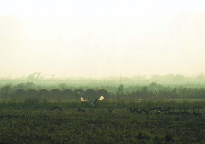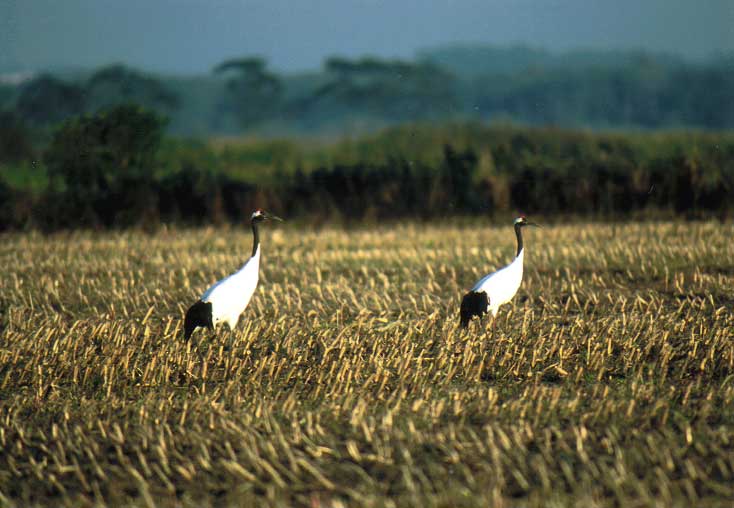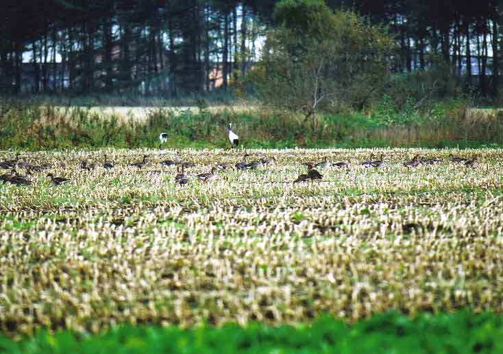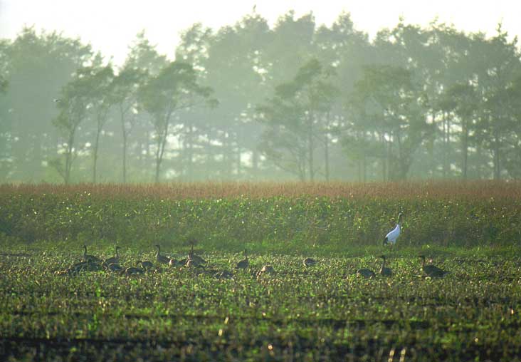 トウキビ畑でタンチョウと一緒に採食するオオヒシクイ