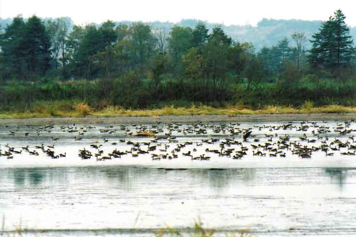 群れが集結した大沼、オオヒシクイは首を水中に入れ、盛んに水草を採食していた