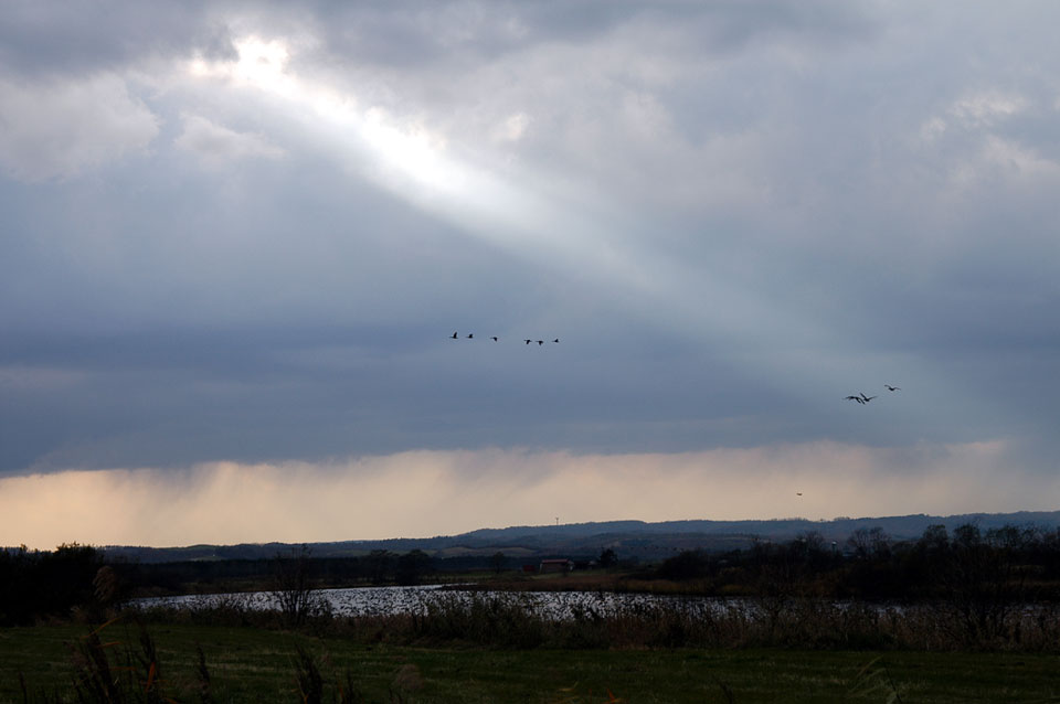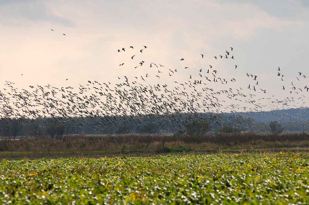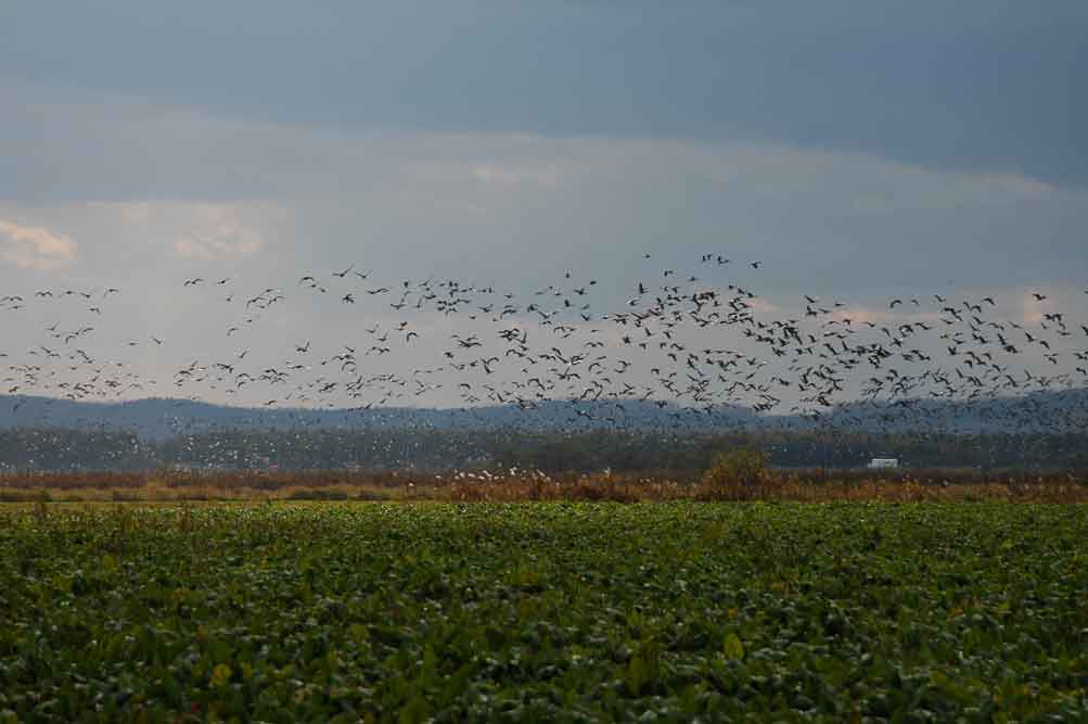 13:20〜三日月沼周辺の牧草地から数千羽のオオヒシクイなどの大群が上空へと飛び上がり圧巻。その中