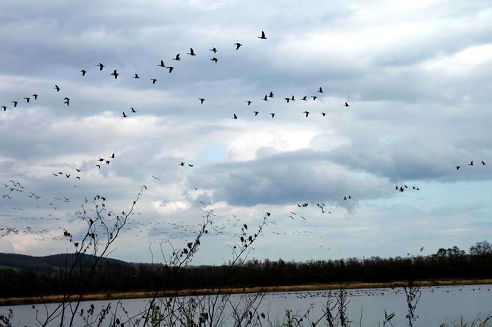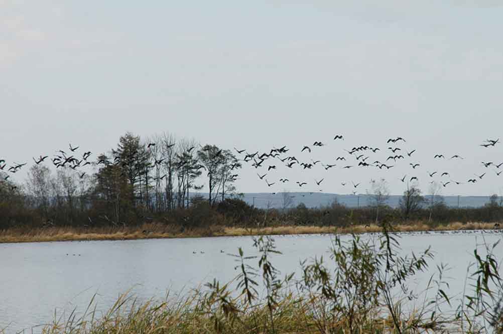 ここにもオオヒシクイの群れが数百羽いたが、突然飛び上がってしまった。このように原因は分からないが一斉に飛び上がっては観察者をがっかりさせる 沼を飛翔するオオヒシクイ やがて幾つかのハクチョウとカモが沼に残った いつ来ても変わらぬ沼風景