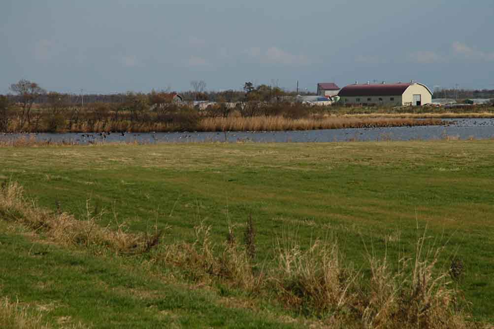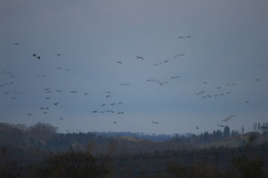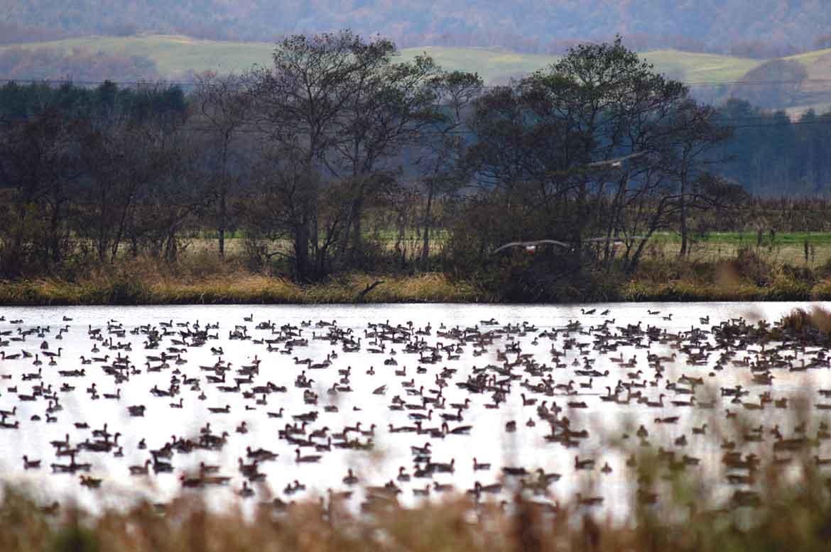 二回目に訪れた時は、小さな沼いっぱいにオオヒシクイ、ヒシクイ、マガンが密集していた