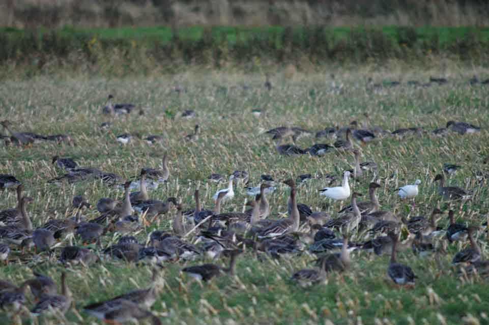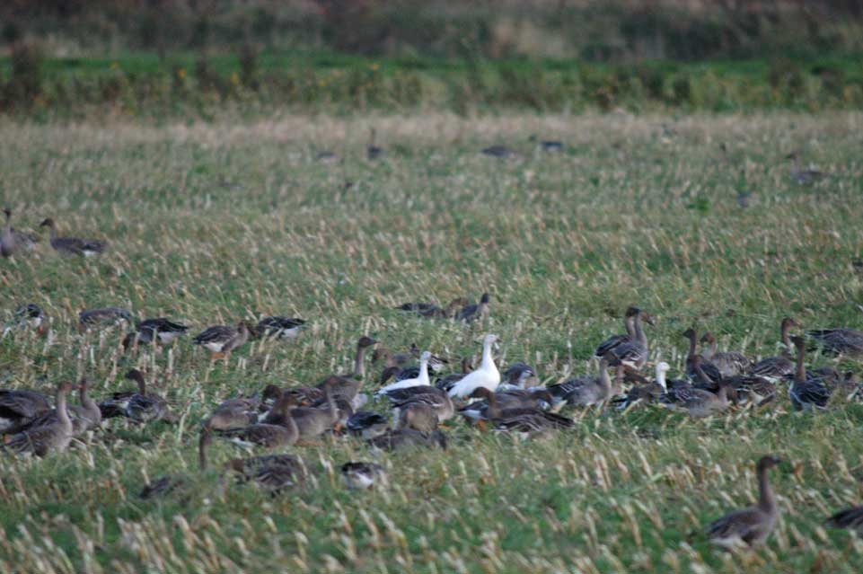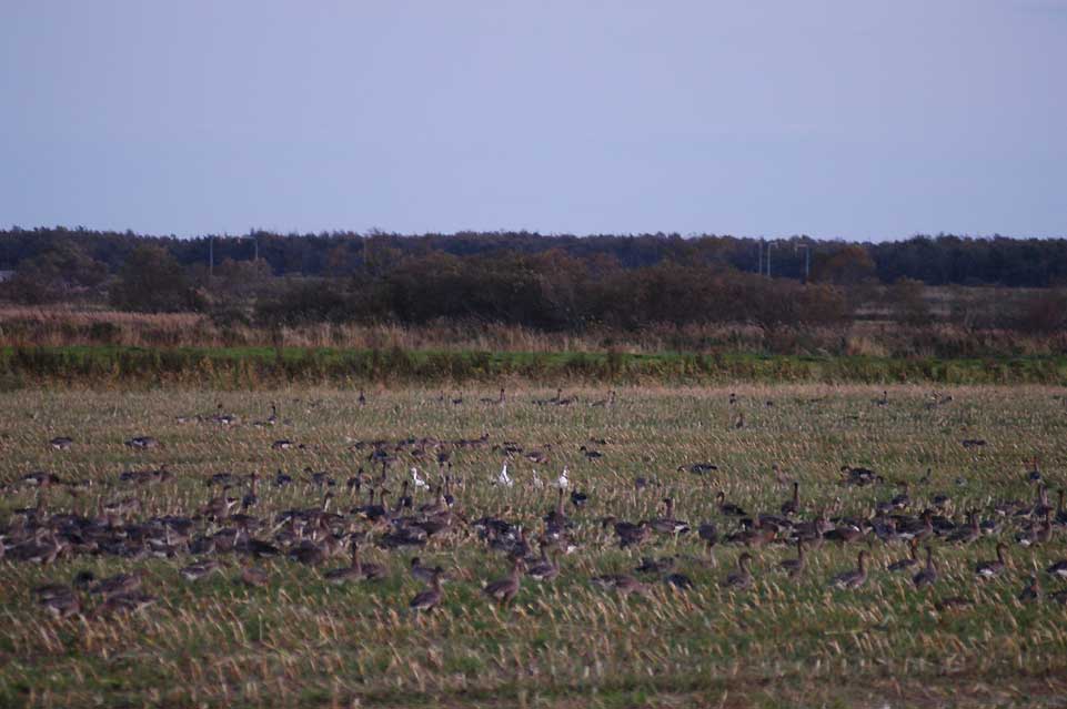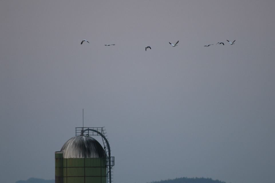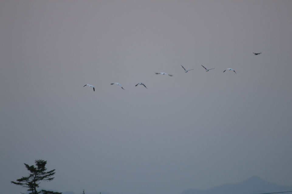 夕暮れ近くで、また、距離も遠くよく見えない オオハクガンと思われる1羽だけ大きな個体が見える 帰ろうとした矢先、飛んで行ったハクガン7羽 時間があれば、まだ撮影したかったがもう直ぐ日が暮れる時間帯で残念
