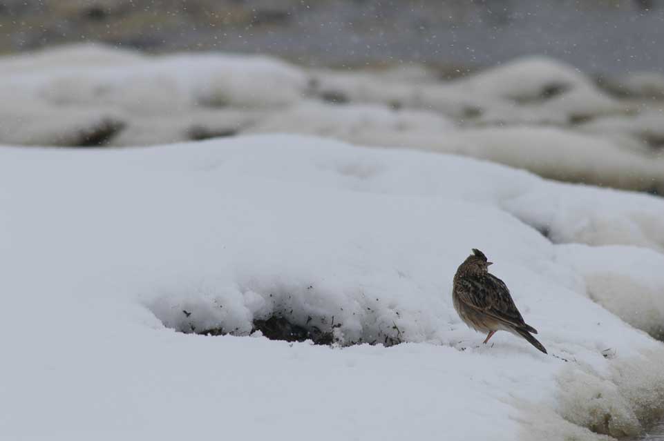 南の国からやって来たヒバリも予想外の降雪で餌を探すのに一苦労