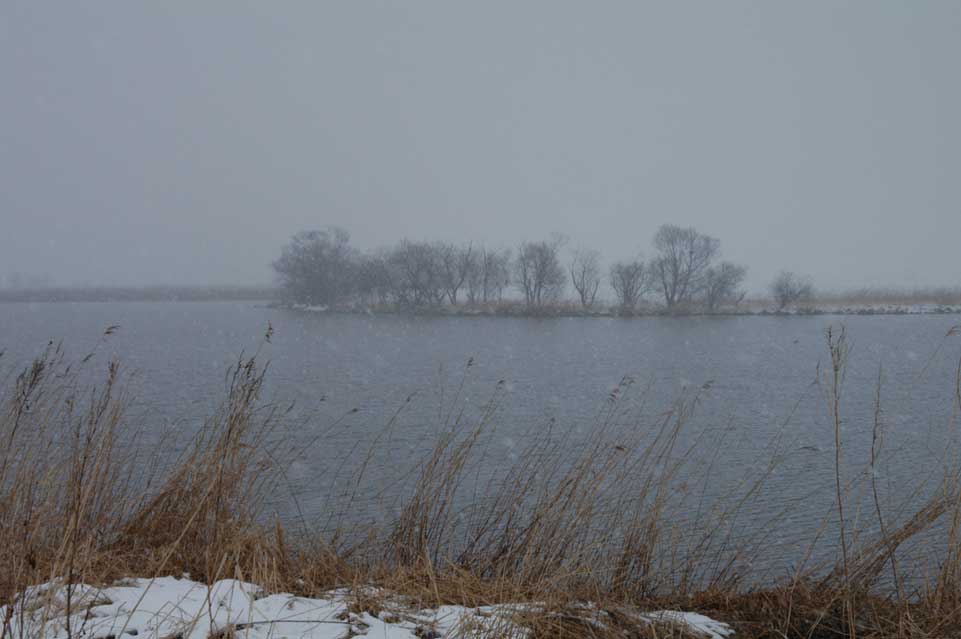 14日の浦幌町はどこも吹雪で三日月沼もご覧のとおり