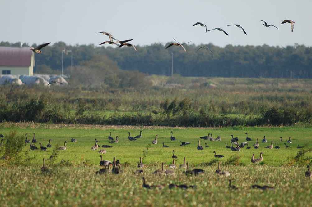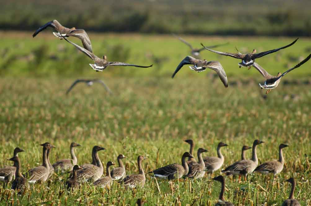 次々と飛来しては地上に降りるオオヒシクイ