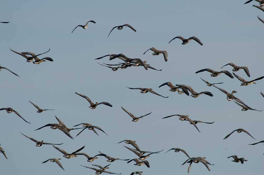 北西方向より飛来するオオヒシクイ。高度が高いので遠くから飛来してきたと思われる。