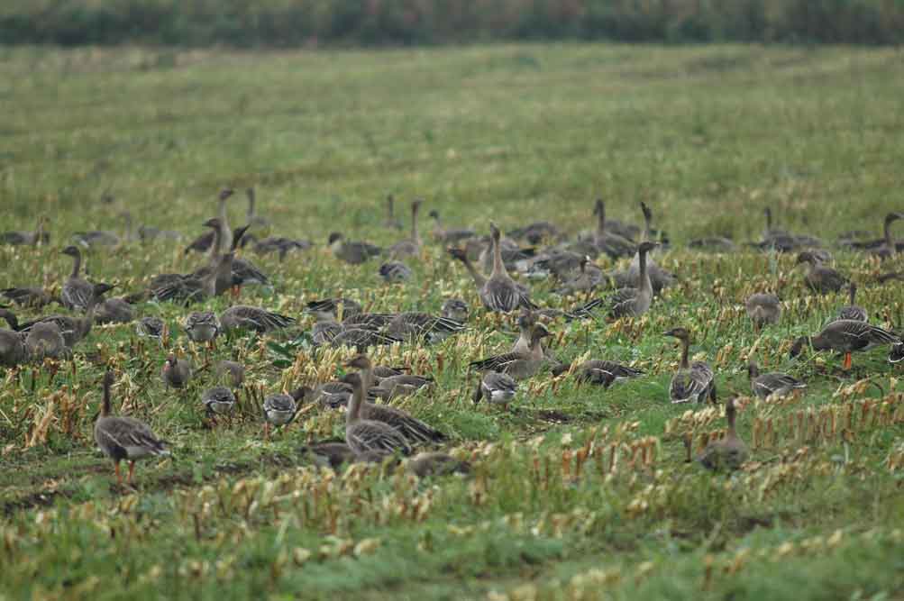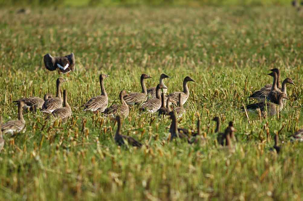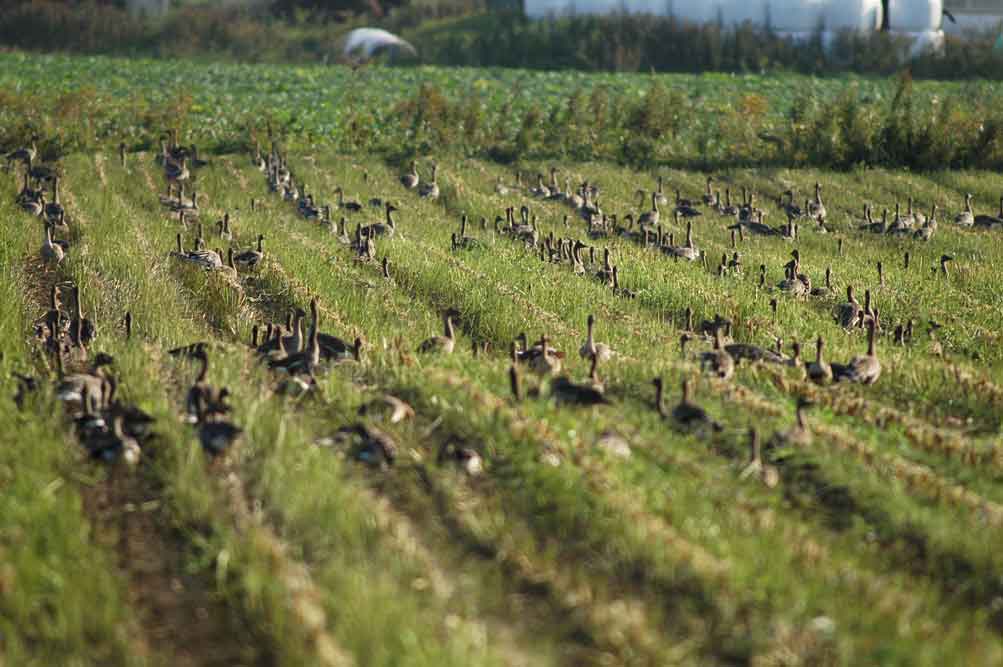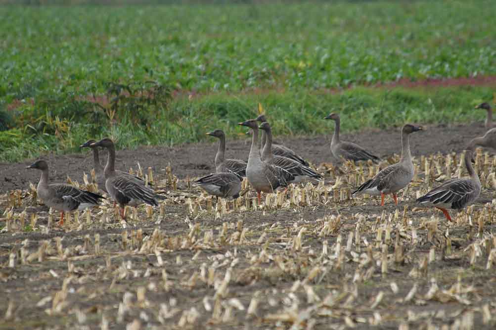 警戒してか首を上げたオオヒシクイ 首を前に突き出すオオヒシクイ独特のポーズが私は好きだ 嘴はガンの仲間でも大きさ、長さ共最大級 餌となるトウキビは、オオヒシクイの餌となるよう農家の人が茎を残し、長く刈ってくれている 秋はトウキビ畑にいることが多い
