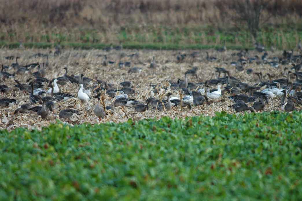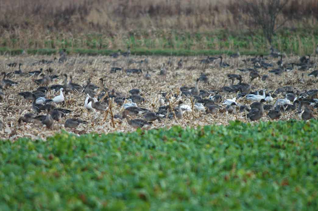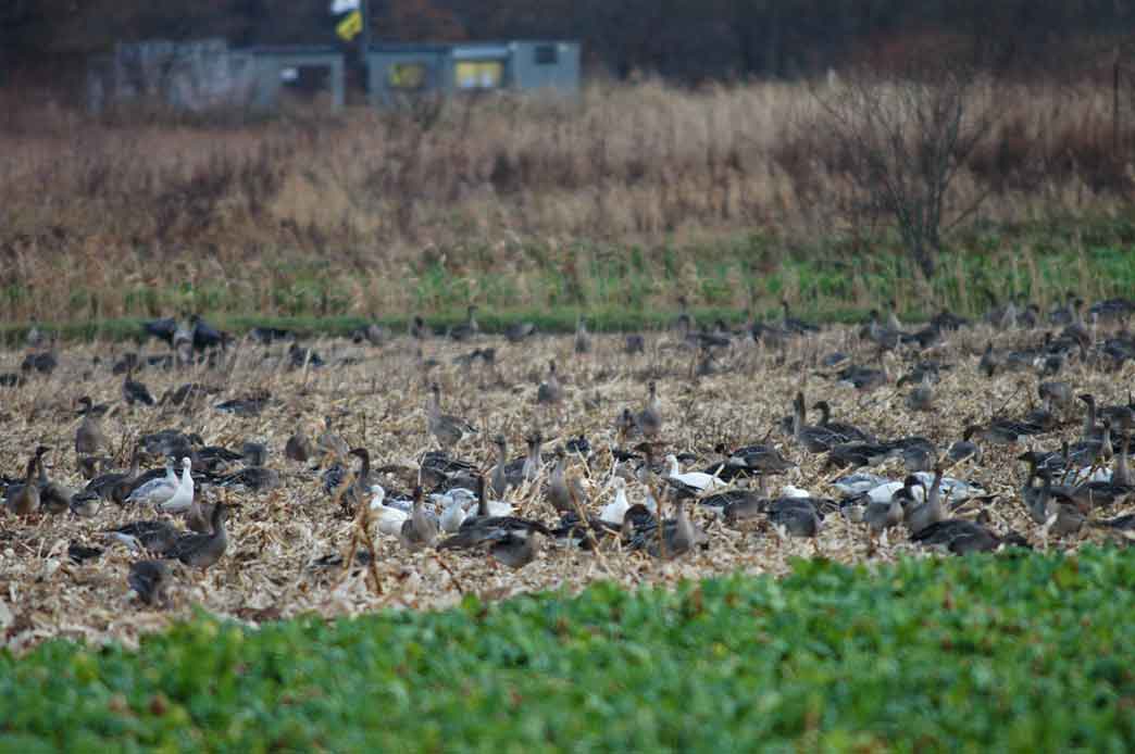 この時点で午後4時、北海道では、辺りがそろそろ暗くなる 画面上では明るいが実際はかなり薄暗い 小さく写っているので見逃しそうであるが、画面右側にシジュウカラガン1羽 ねぐら入りが近い性か、一斉に採食するオオヒシクイとハクガン