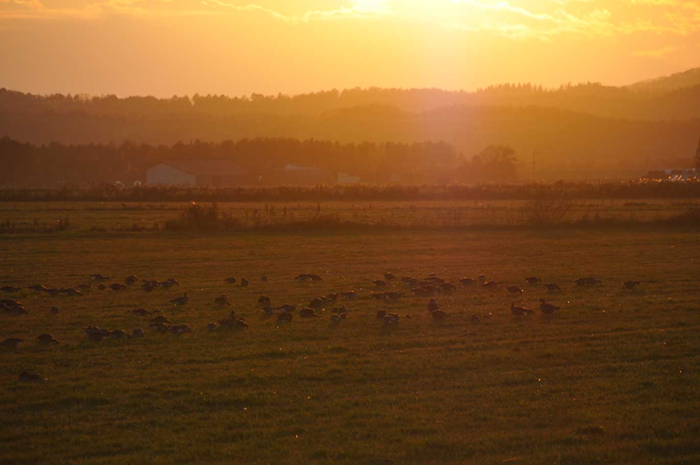 夕陽に染まる十勝平野、マガン、ヒシクイが最後の夕食タイム